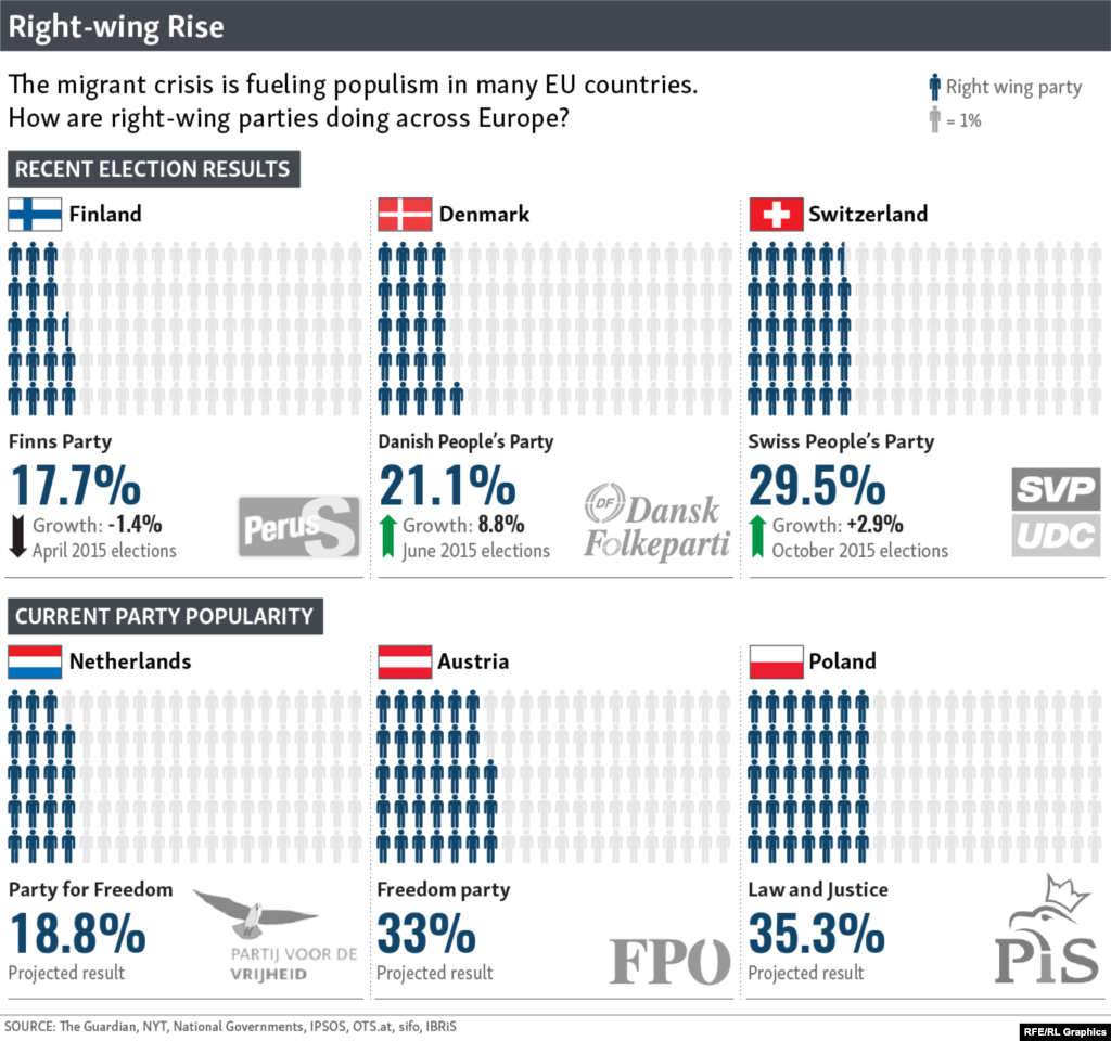У деяких випадках посилення позицій націоналістів та крайніх правих було результатом виборів. Так, цього місяця антиімміграційна швейцарська Народна партія здобула приблизно 30 відсотків голосів під час парламентських виборів 18 жовтня.
